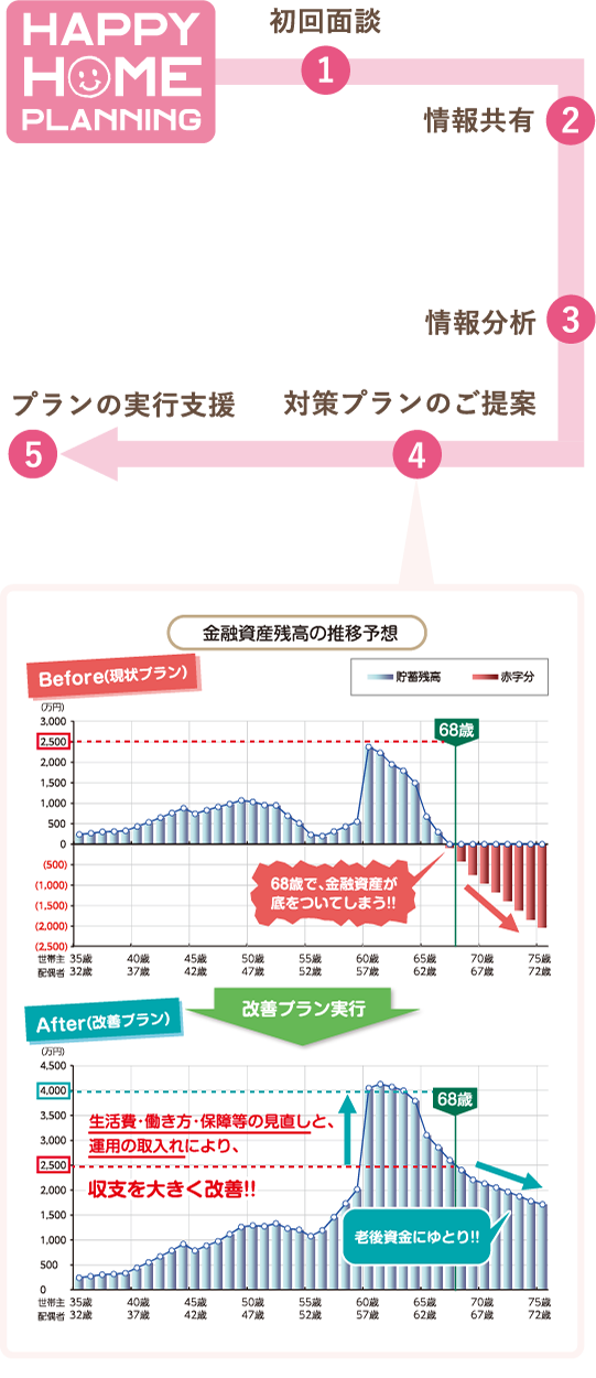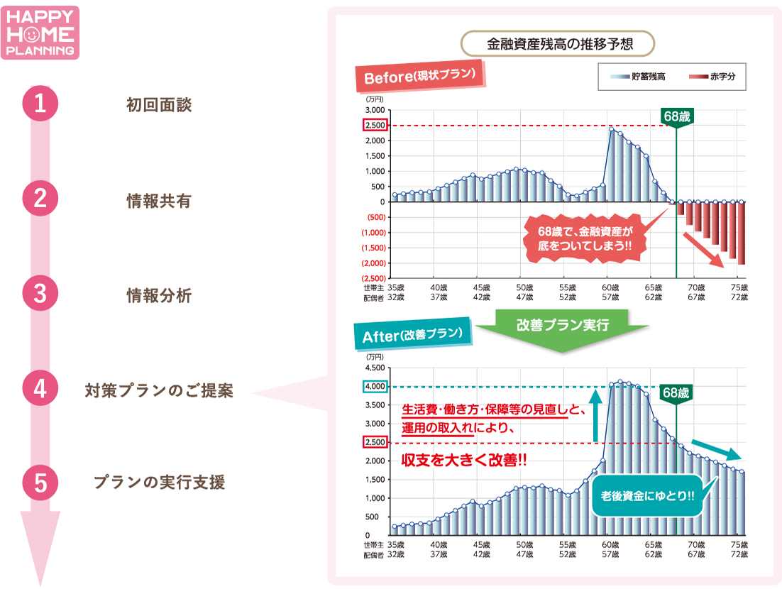 お客様ごとに異なるご家族構成やライフプランを熟慮し、住宅ローンシミュレーションや購入後の繰上返済、貯蓄プランなどを検討、アドバイスします。「現状プラン」と「対策プラン」の比較など、キャッシュフロー表と診断シートを用いて、わかりやすく、実行しやすいアドバイスや支援を行っています。